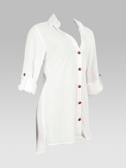 Es una camisa clásica muy bonita con botones en cuero que la puedes acompañar de un cinturón.