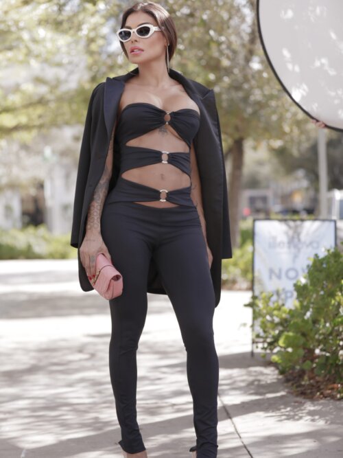La blusa, con su escote en V y un sutil diseño con la espalda semi descubierta, aporta un toque sensual sin perder la elegancia. El pantalón, de caída fluida y favorecedora, estiliza la silueta con un ajuste impecable.